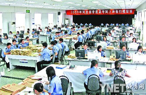 經(jīng)過武警和當?shù)乜荚嚈C構(gòu)的嚴格檢查,記者首入設(shè)置在河北省考試院的答題卡掃描現(xiàn)場。寬敞明亮的大廳內(nèi),100多名河北某司法院校的學(xué)生經(jīng)過培訓(xùn),正在按流水線操作、軍事化管理的方式,在26臺高速掃描儀上分科目進行高考答題卡的掃描。